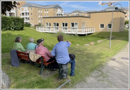 D. 9. juni var vi på byvandring i Husum og bl.a. på jagt efter stedet, hvor den gamle herregård Husumgård lå, hvor Leonora Christine opholdt sig i 3 måneder efter Blåtårn i 1685. Vi var desuden på jagt efter rester af det gamle, elskede gadekær i Husum. På billedet ses en gruppe af foreningens medlemmer på en bænk i det grønne mellem AAB-bygningerne i 'Downtown Husum'. Byvandringen sluttede her med kaffe og kage med udsigt til det ene af Husums to gadekær. Der er i dag er hele to små søer med siv på det sted, hvor Husum landsbys kendte og elskede gadekær befandt sig i gamle dage. foto hbs