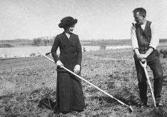 Billedet forestiller mand og kone, der netop har købt et stykke jord på bakken ovenfor Brønshøj Kirkemose og er opfyldt af drømmen om eget hus. Billedet er fra o. 1910.