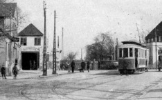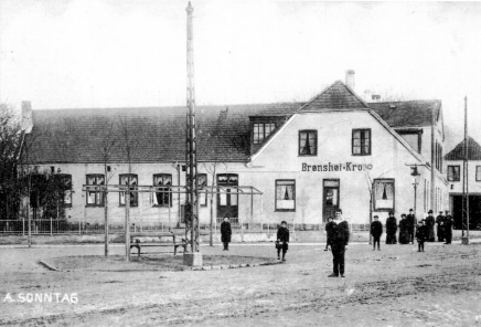 Brønshøj Kro på Brønshøj Torv med et selskab, der har taget opstilling til ære for fotografen. Kroen var samlingsstedet for bydelens borgere gennem generationer og havde faktisk eksisteret lige siden 1600-tallet. I 1935 havde den udtjent sin rolle og blev revet ned i forbindelse med en omfattende omlægning af Brønshøj Torv. Den gamle smedje forsvandt og på samme måde det meget populære 'Brønshøj Tivoli' - et etablissement, der rummede en stor have, keglebaner, teatersal og restaurant. Det blev afløst af 'Bella Bio-bygningen.