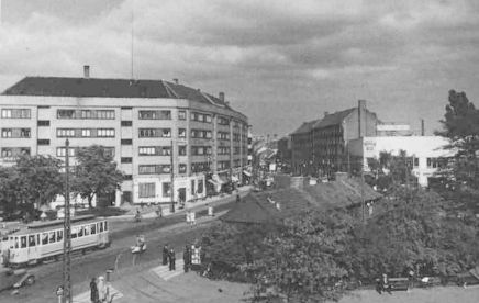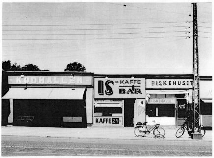 1950. Frederikssundsvej tæt vedBrønshøjholms Allè med Kaffebaren, der i mange år kaldtes Familjen Hansen, hvor man kunne se fjernsyn og spise is siddende i amerikanske røde sofaer. Kødhallen eksisterede langt op i 1970'erne, mens Fiskehuset blev overtaget af trævarebutikken Garanta.