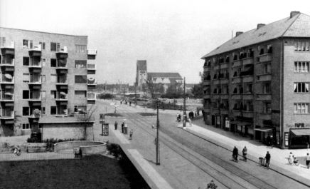 1940. Frederiksborgvej på vej op mod den nybyggede Grundtvigskirken. Bemærk den sparsomme trafik, vel nok på grund af krigen.