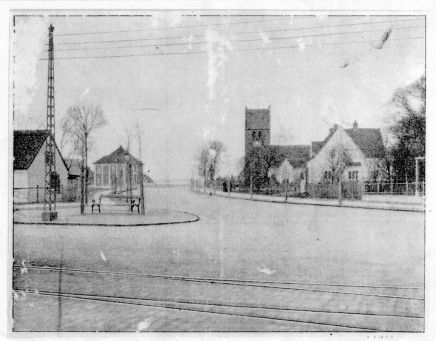 1911 Brønshøj Torv. Den nye hvide præstegård troner til højre og den første patriciervilla på toppen af Brønhøj Kirkevej kan ses i baggrunden. Brønshøj Torv er ikke synderlig befærdet, i forgrunden ses skinnerne til sporvognen, som meget tidligt betjente den nye københavnske forstad.